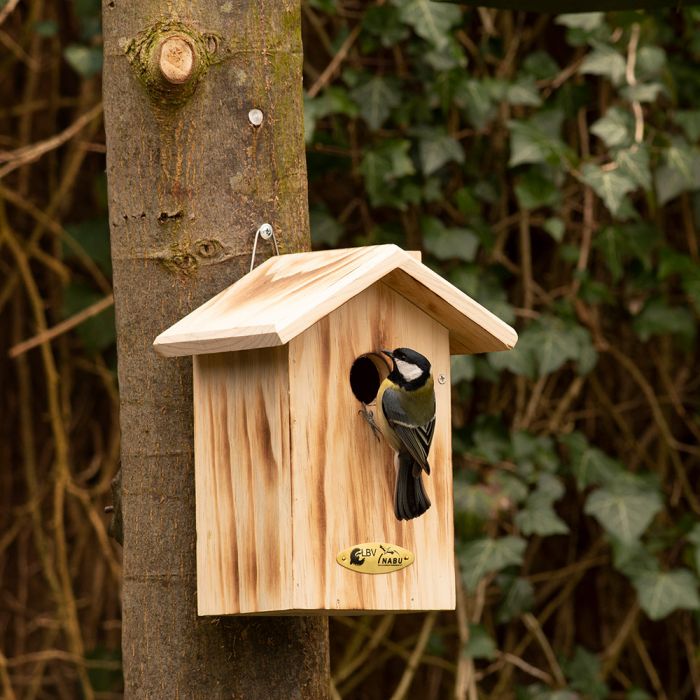 Mit seinem großzügigen Nistraum und einem Flugloch von 3 cm Durchmesser ist dieser Nistkasten vor allem für höhlenbrütende Kleinvögel wie Meisen, Kleiber oder Gartenrotschwänze gedacht. Die Vorderwand des Kastens lässt sich zur Reinigung ganz nach oben schwenken, im geschlossenen Zustand wird sie von einer Ringschraube an Ort und Stelle gehalten. Die Innenwände sind vollständig angeraut und mit Rillen versehen, die den Jungvögeln als Kletter- und Ausflughilfe dienen sollen. Die um das Flugloch herum angebrachte Metallplatte hindert anfliegende Spechte daran, es für sich zu vergrößern (mit anderen Worten: Diesen Nistkasten für die kleineren Vögel unbrauchbar zu machen), und ein Anstrich mit Pflegeöl schützt das Holz vor vorzeitigem Vergrauen.